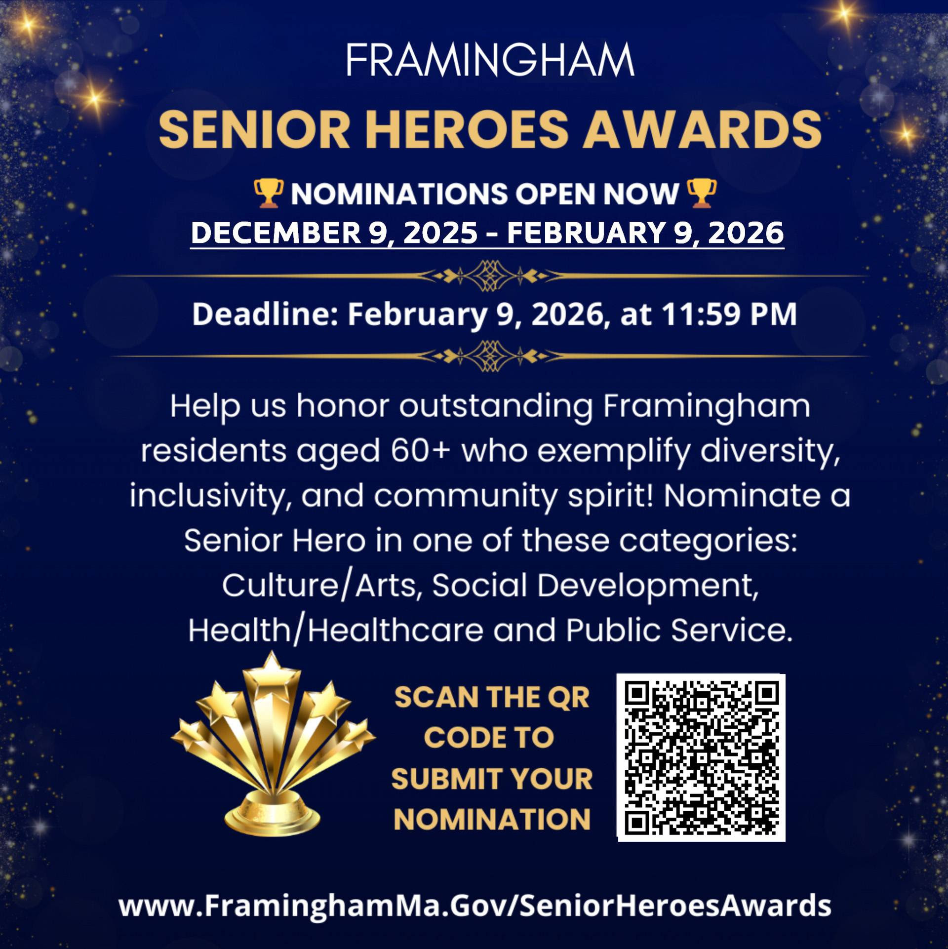 Nominations are open for the Framingham Senior Heroes Awards! These awards are given to four residents who are 60+ years old, who volunteer efforts reflect their value for diversity and show significant contributions to inclusivity in Framingham.