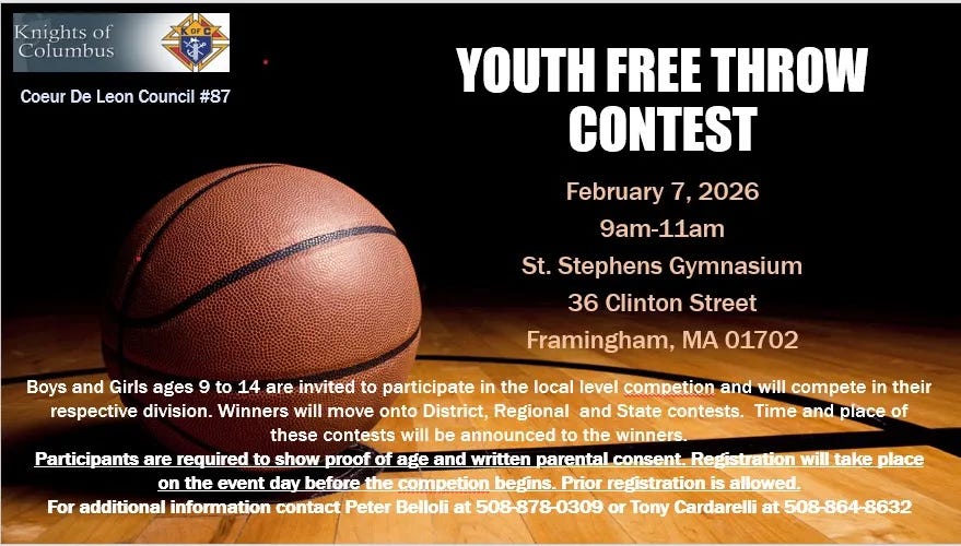 The Framingham Knights of Columbus Council is sponsoring their annual Youth Basketball Free Throw Content.
