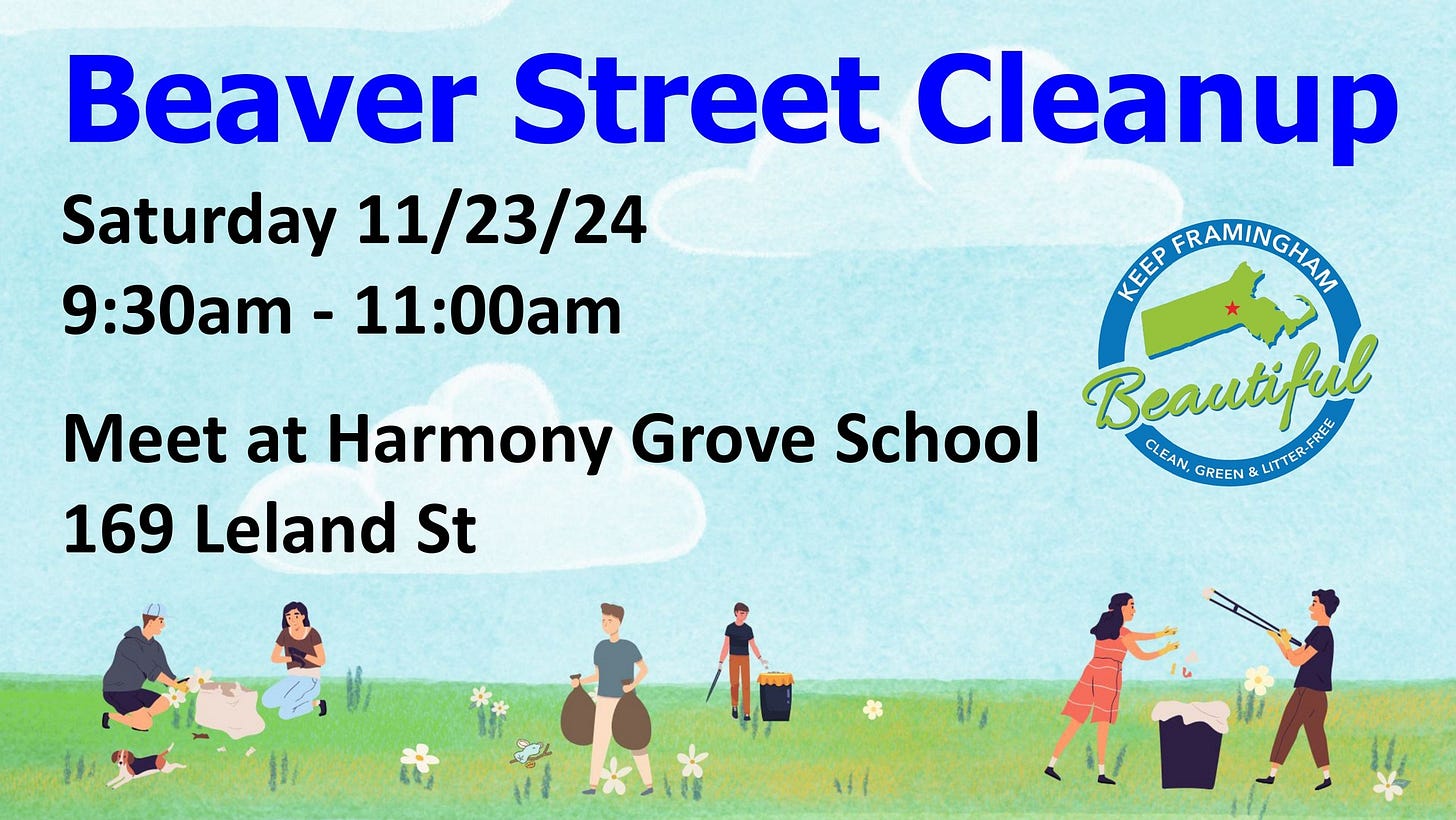 KFB Neaten Up November Continues: Help KFB clean up the Beaver Street area as part of our ongoing efforts to Keep Framingham Beautiful!Park & Meet at Harmony Grove School - 169 Leland Street. Please bring a grabber if you have one & wear bright colors for safety. We will have loaner grabbers for those that don’t have them