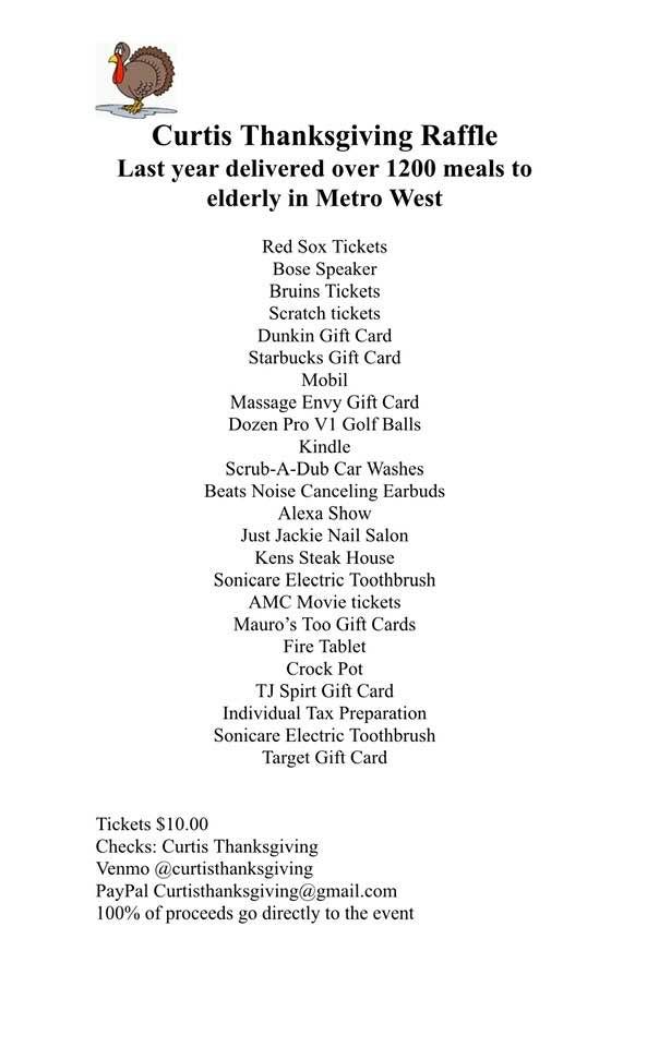 Support the Curtis Thanksgiving Dinner: For 35 years, Karen and Mark Curtis have provided a roast turkey dinner to those in need. Last year more than 1200 meals were delivered to elderly in MetroWest. If you are in need of a meal or know someone who is please email Curtisthanksgiving@gmail.com. Help support their efforts through their yearly raffle. Tickets are $10.00 with 100% of proceeds going directly to the event. Please see the flyer below for a list of items and how to purchase.